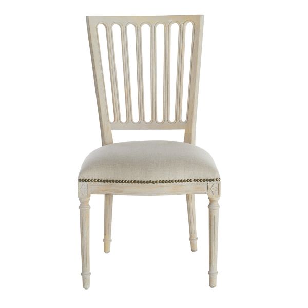 This elegant French-inspired dining chair brings a blend of classic charm and contemporary style. The distinctive lattice back design adds a sophisticated, airy feel to your dining space, while the soft, cushioned seat ensures comfort during long meals. The chair is beautifully finished with a nailhead trim that circles the seat, enhancing its timeless appeal. With a sturdy solid wood frame and no armrests, it offers both style and practicality, making it a perfect addition to any dining room or kitchen with a touch of vintage French flair.